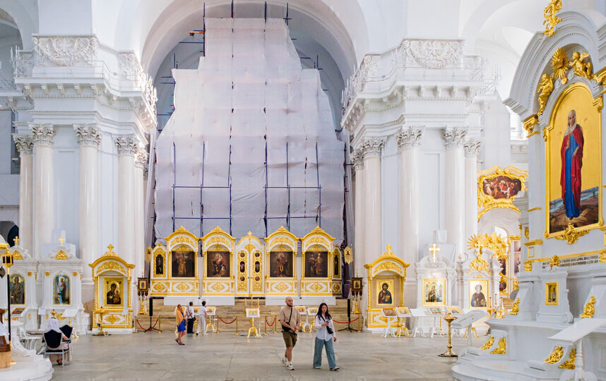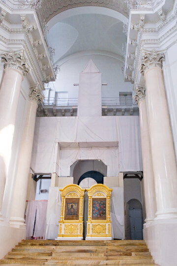Когда закончатся реставрационные работы, никто не знает. После того как в храме появится иконостас, начнут восстанавливать царское место и балюстрады.