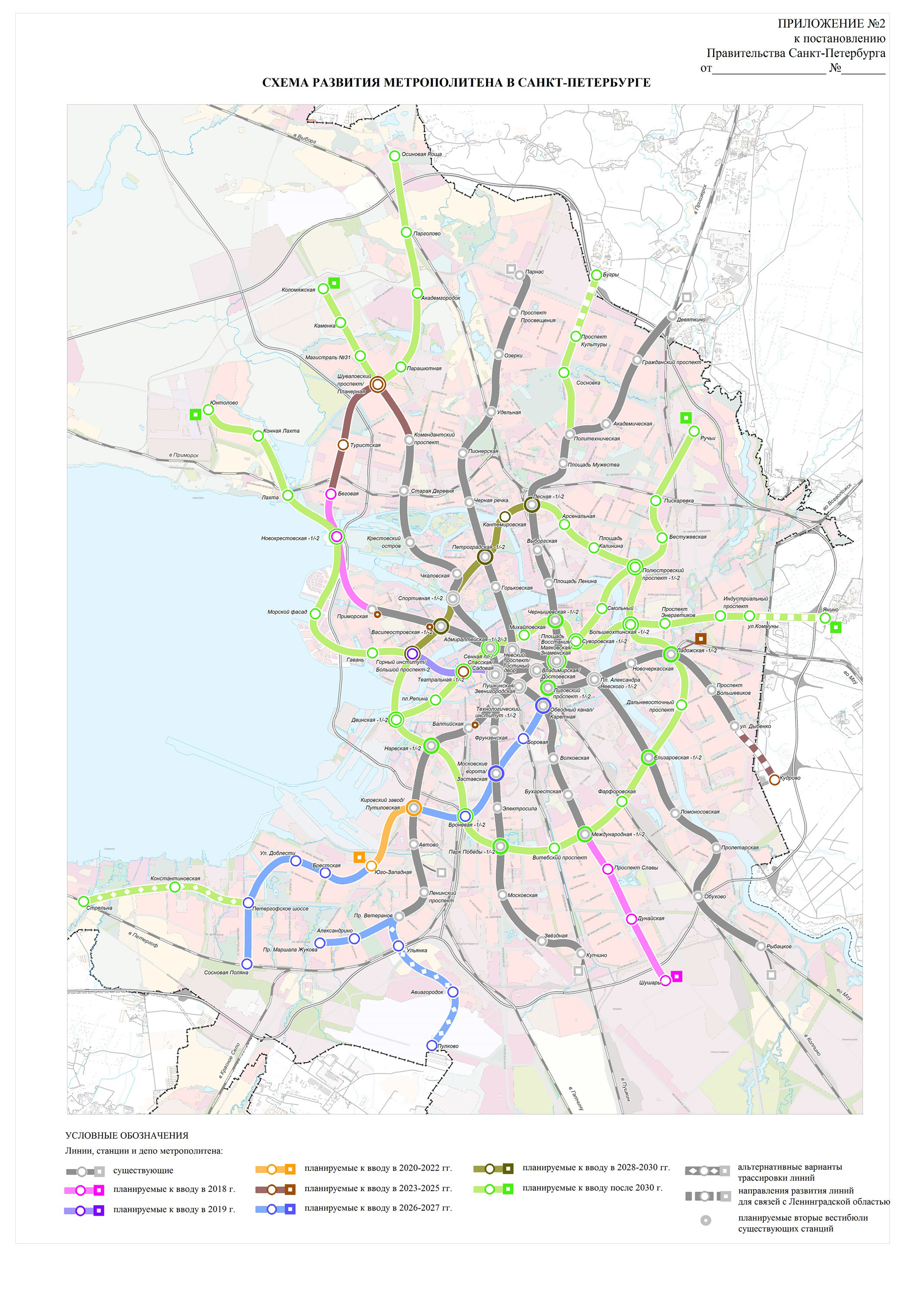 На 3 года, к 2025 году, отодвинуто строительство перегона от "Беговой" и "Комендантского проспекта" к "Шуваловскому проспекту" и "Планерной", в те же сроки должна появиться станция "Кудрово". В план до 2028 года, как альтернативные варианты, внесены линии до Пулково и Стрельны.