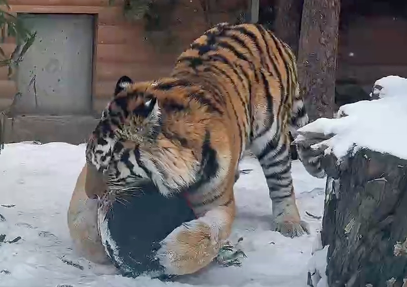 Подаркам все животные очень обрадовались и даже пробовали их на зуб. Первым игрушку вручили тигру Зевсу. Он сразу начал с энтузиазмом атаковать новую бочку.