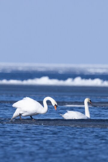 Издали силуэты на воде походили на небольшие льдины, но вблизи становилось понятно, что это белоснежные лебеди, которые время от времени даже подплывали к берегу.