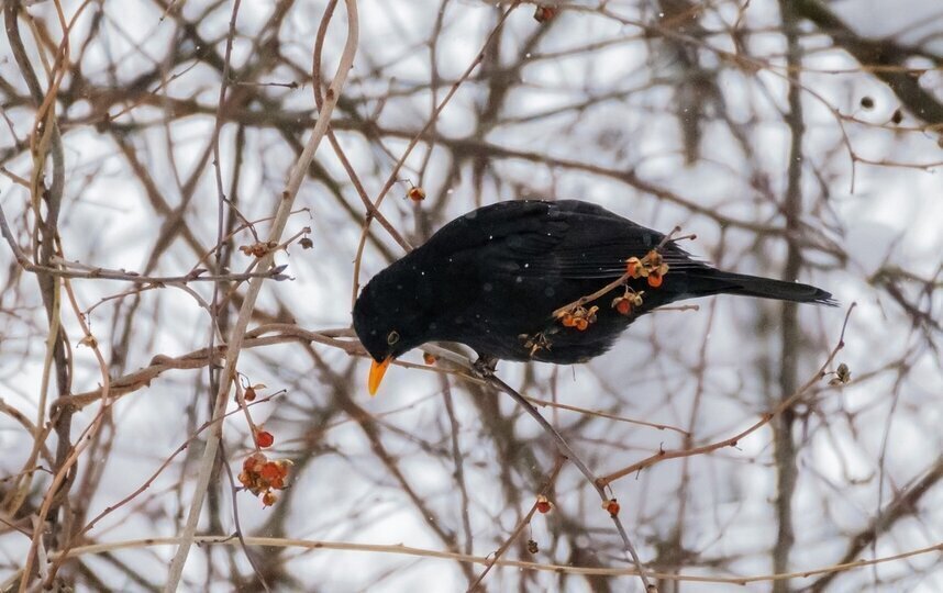 Чёрный дрозд обедает замёрзшими ягодами в Удельном парке