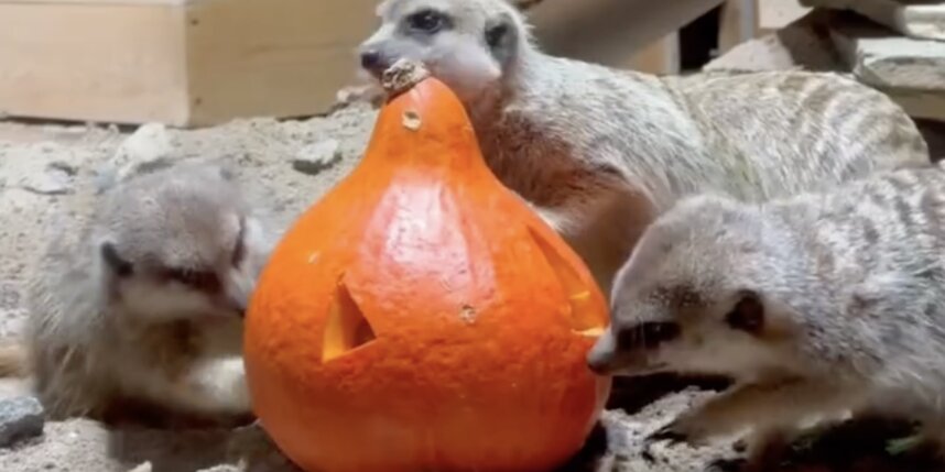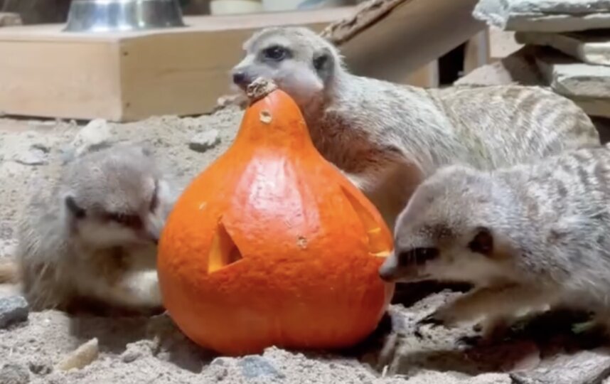 В рамках программы по обогащению среды обитания зоологи превратили обычные тыквы в резные пазлы, наполнив их кусочками яблок, груш и винограда. Эти яркие осенние "сюрпризы" были предложены сурикатам и полосатым мангустам.