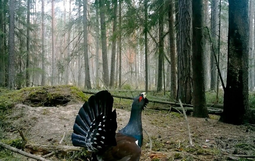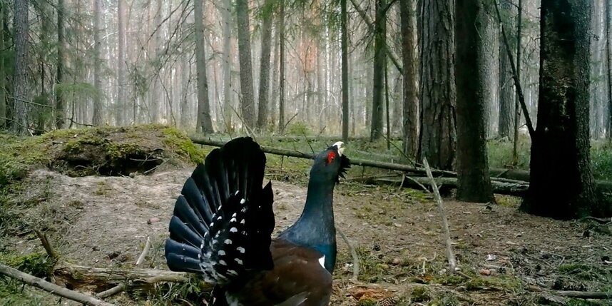"Распушив хвост и подняв вверх голову, глухари издают призывную брачную песню – токуют. Мотив состоит из двух колен: сначала щелкающие звуки, а затем брачная песня переходит в скрежет, который специалисты называют точением", – поясняет Павел Глазков.