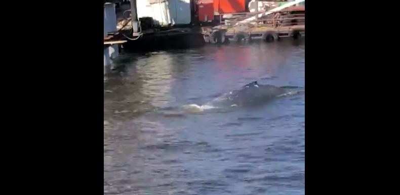 Видео, как кит плавает в водах залива, можно посмотреть ЗДЕСЬ (осторожно, нецензурная брань, 18+).