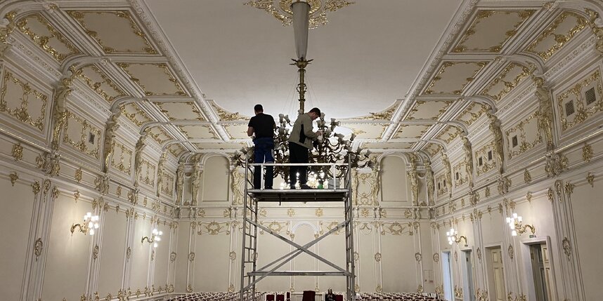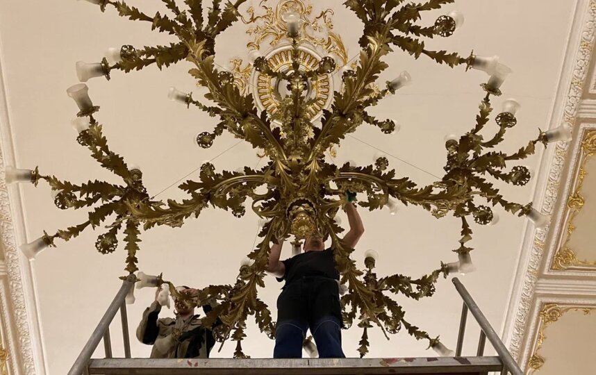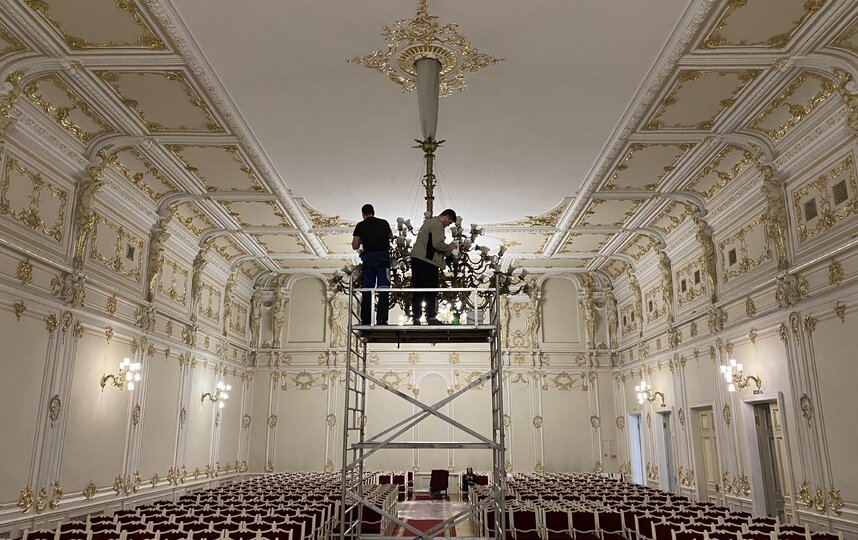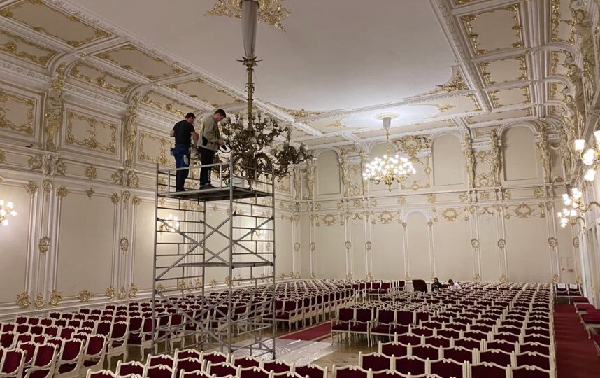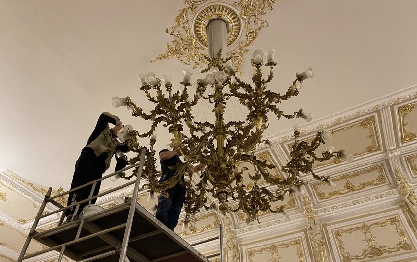Сегодня был один из дней, посвященных генеральной уборке Филармонии: в концертном пространстве, где выступали крупнейшие музыканты второй половины XX века, мыли исторические люстры.