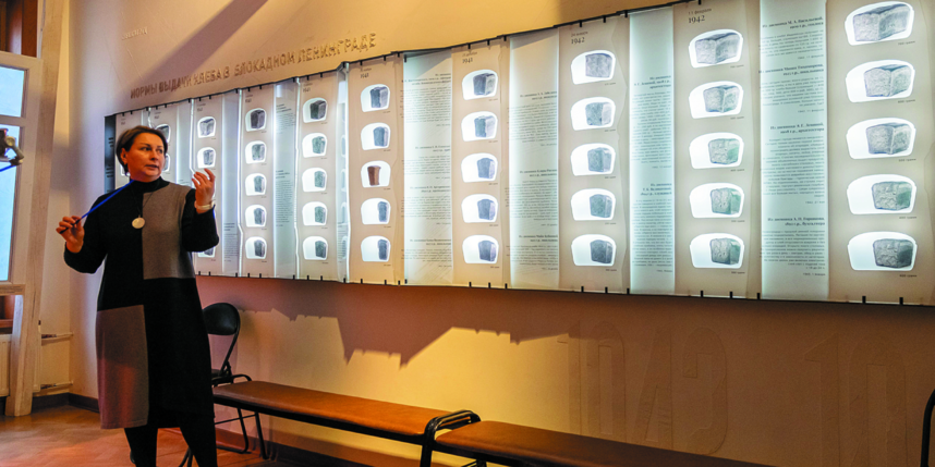 Отдельная экспозиция посвящена блокадному Ленинграду. Тяжесть того времени показана через бедную обстановку обычной комнаты и суточный паёк на одного человека.