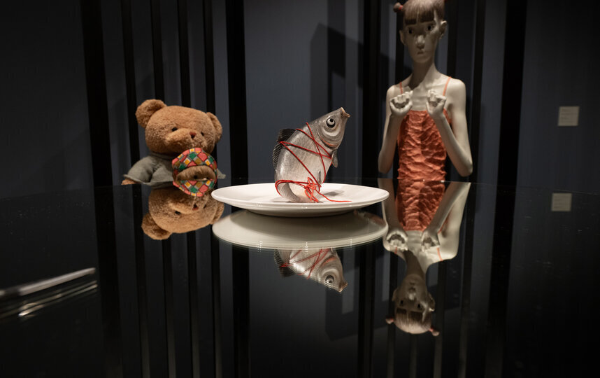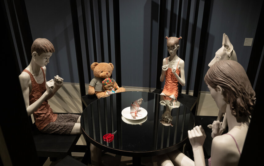 За чёрным глянцевым столом сидят пятеро: женщина, два подростка – мальчик и девочка, а также собака и плюшевый медведь. Посередине тарелка с "живой" рыбой. Загадочная семейная трапеза дело рук художника из Поднебесной Куньчжао Ван. Свои скульптуры он сравнивает с акупунктурой.