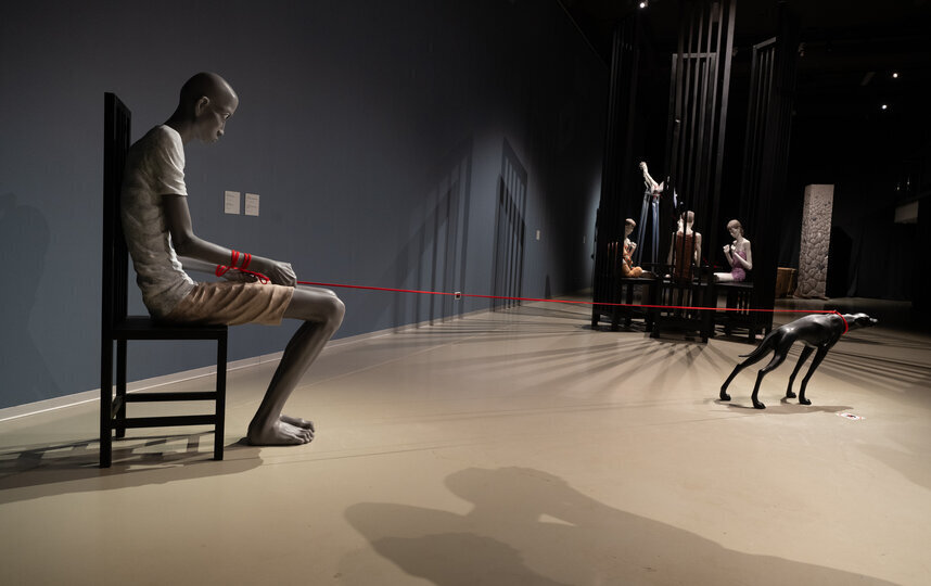 Зверь, рвущийся на волю, встречается сразу в нескольких скульптурах. Собака на поводке, который держит двумя руками худой человек в пижаме, уже мёртвая птица на привязи скорчившегося мужчины. Такие сцены – символ борьбы внутреннего Я и Я в социуме.