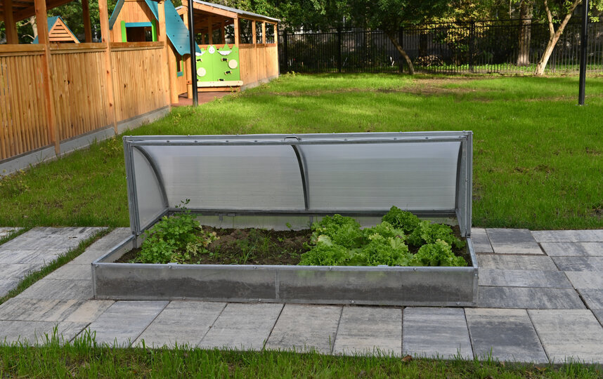 Новое оснащение уличной площадки располагает к знакомству с ботаникой. Под окнами детсада оборудовали парник и вазоны с прозрачными стенками. Это позволит малышам следить за развитием корневой системы растений.