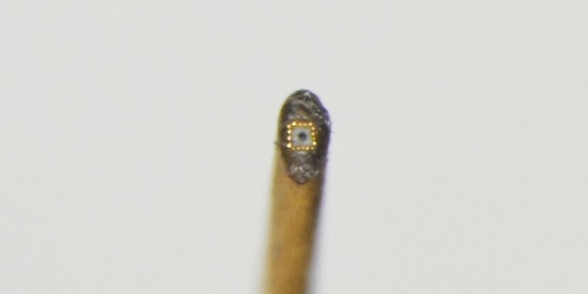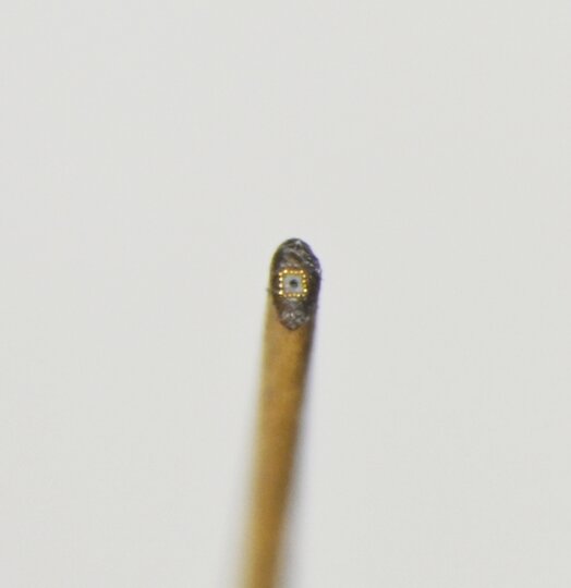 "Диаметр волоса примерно 42 микрометра, – рассказал Владимир Анискин. – Для сравнения и понимания: толщина лезвия для бритья примерно 100 мкм (0,1 мм), толщина листа бумаги тоже около 100 мкм. Я специально выбрал самый маленький понятный объект – человеческий волос. Создать такую микроминиатюру я задумал несколько лет назад. Проблема была в рамке – я долго не мог придумать как её сделать. В конце концов решил обойтись без неё. Для этого на торце волоса ставил пятно белой краски. Затем, когда краска подсыхала, острым резцом аккуратно удалял лишнюю краску. Оставался только белый квадрат – полотно для будущей картины. Дальше одним прикосновением тончайшего волоска с краской на кончике ставил чёрную точку. Картина без рамки смотрелась незавершённой. В результате сделал рамку из малюсеньких золотых шариков, и работа стала выглядеть законченной".