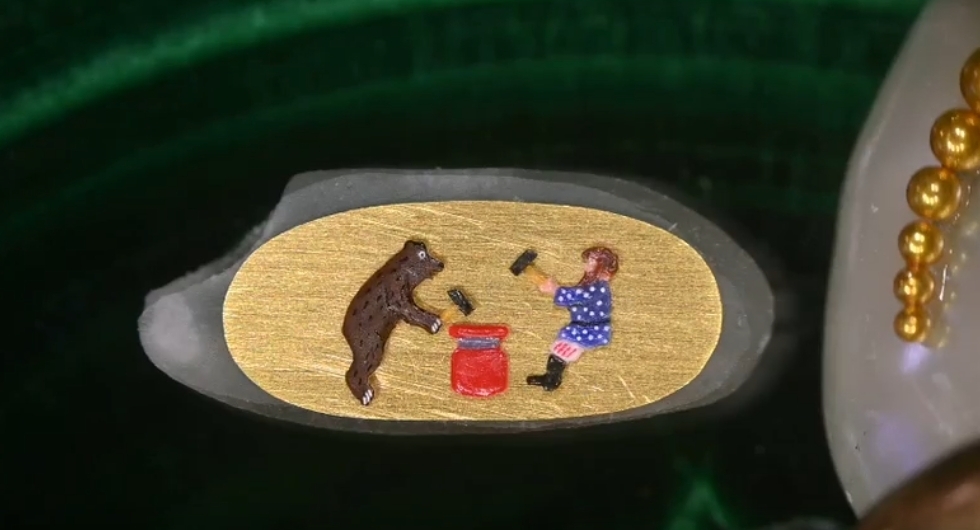 "Это моя первая движущаяся микроминиатюра, – говорит мастер. – Вдохновился я русской деревянной игрушкой с таким же названием – "Мужик и Медведь". Фигурки расположил на рисовом зёрнышке. Несмотря на то что в работе реализовано простое возвратно-поступательное движение, воплотить его в миниатюре оказалось достаточно сложно".