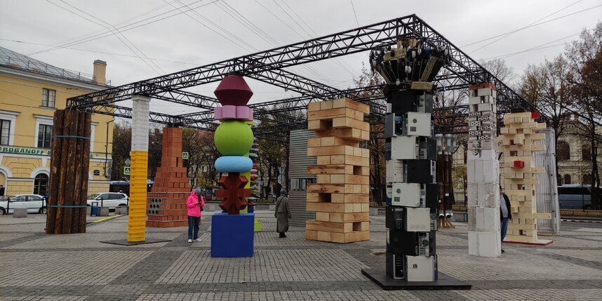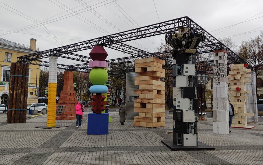 На улице посетителей встречает паблик-арт. Ну как встречает? Он спрятан за самим "Манежем". Инсталляция состоит из 16 колонн, каждая в своём стиле и от разных дизайнеров – участников проекта: башня-сауна, зиккурат, дженга. Место для лучших фото.
