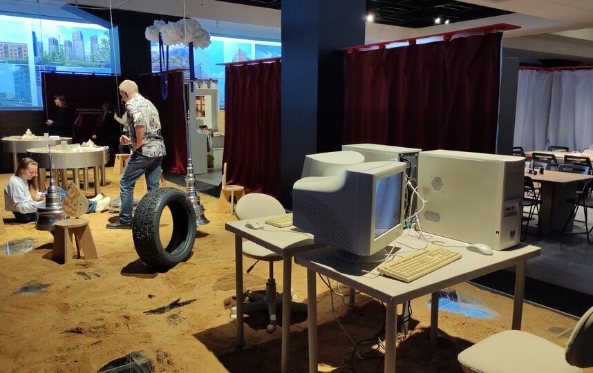 Центральным объектом игровой зоны стала настоящая песочница с игрушками от 16 молодых петербургских архитекторов. Тут можно воссоздать формы знакомых зданий из песка на вибростолах, которые затем автоматически очищаются, запустить волчки со шпилями и поиграть с другими объектами. Город таким образом представлен как площадка для творчества и экспериментов.