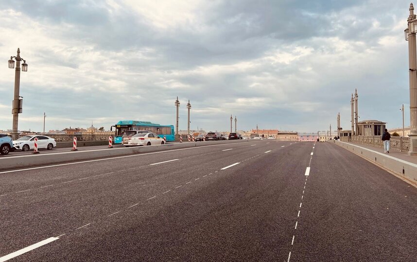 Работы проходили поэтапно, без закрытия движения – сначала на полосах, ведущих с Васильевского острова в центр, затем в обратном направлении. В это время для автомобилей и общественного транспорта были доступны по две полосы в каждую сторону.