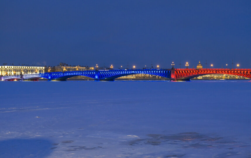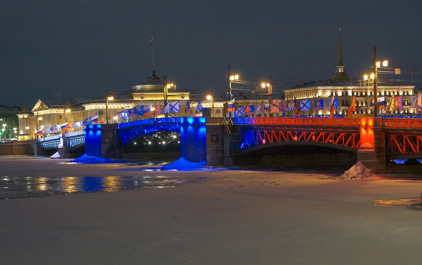 Как сообщила 22 февраля пресс-служба Смольного, сегодня в полночь подсветку в цветах триколора зажгут на Дворцовом и Троицком мостах, а также на мосту Бетанкура. Она будет работать до 08:10 утра, а затем с 18:15 до 23:59 часов 23 февраля.