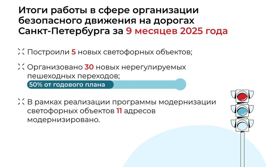 Были установлены 5 новых светофоров и улучшены 11 уже имеющихся. Также на 52 адресах появились 105 современных светофоров типа Т.7. Специалисты обновили 5 627 дорожных знаков и сделали 682 227,7 квадратных метра дорожной разметки, информирует пресс-служба комитета.