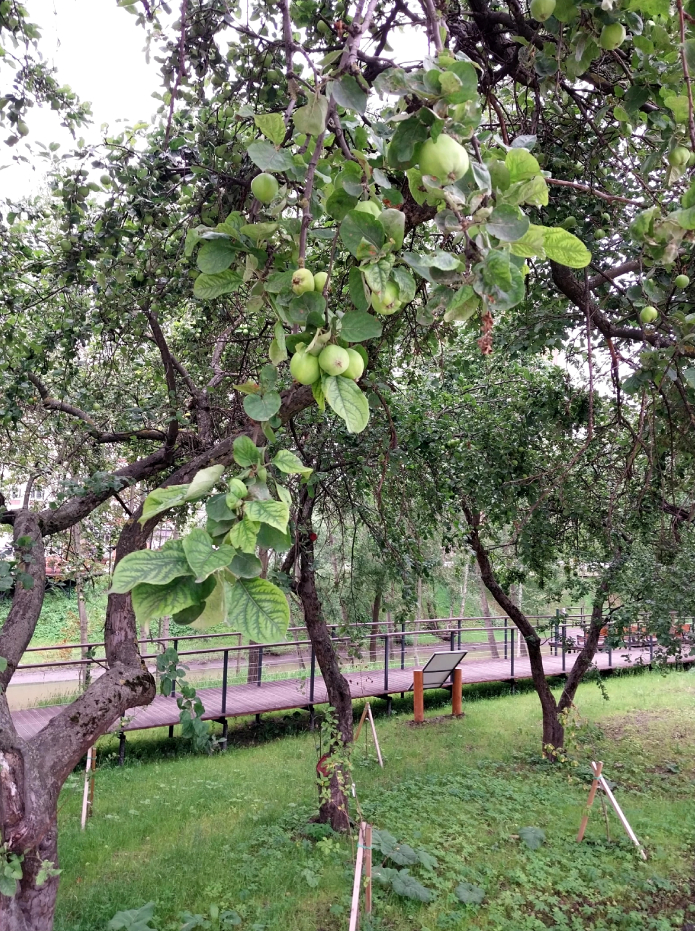 Сейчас о богатом садовом прошлом этой территории напоминают лишь эти пять фруктовых деревьев. И несмотря на заверения ботаников, что яблони живут 60–100 лет, старинные растения живее всех живых: каждый год покрываются пышной зелёной листвой и плодоносят. Не зря же на табличке с QR-кодом про них написано "Ещё сто лет простоят".
