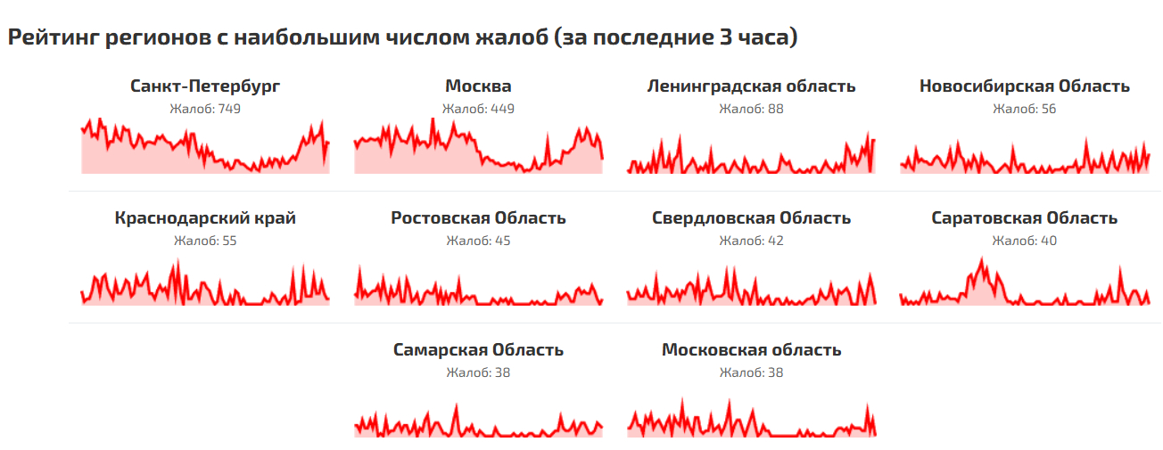 Как отмечается на сайте СБОЙ.РФ, на данный момент Петербург возглавляет рейтинг регионов с наибольшим числом жалоб за последние три часа. При этом количество претензий продолжает увеличиваться.
