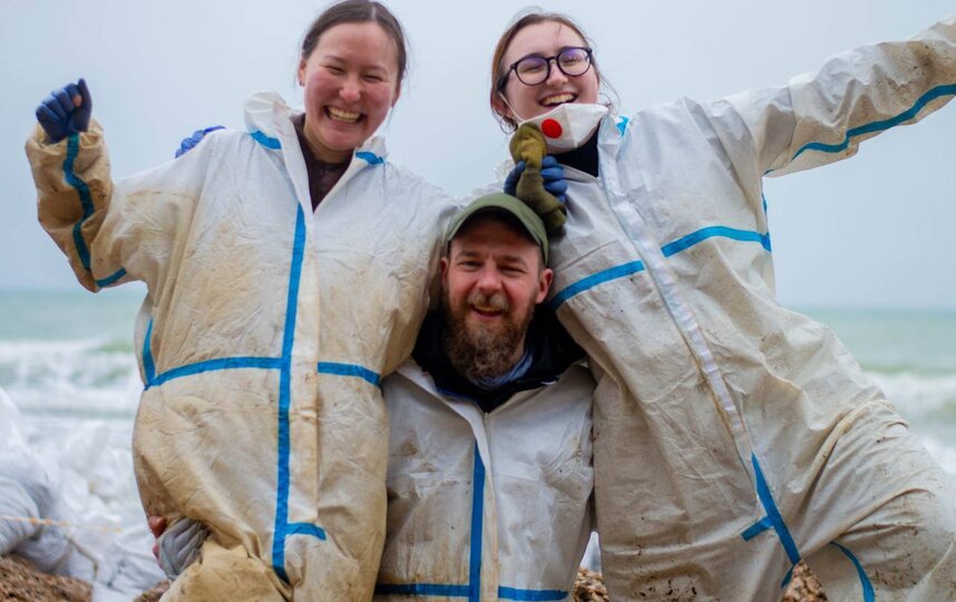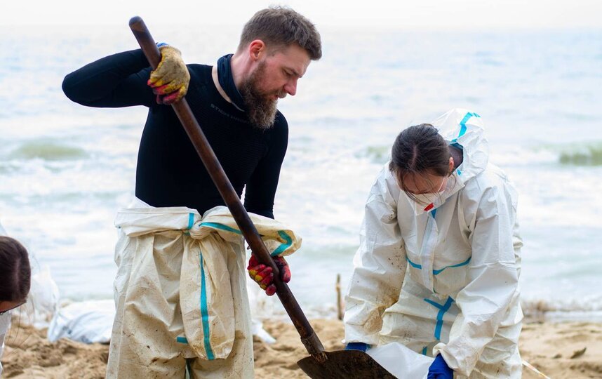 Волонтёрам выдали спецодежду и инвентарь. Девушек отправили на пляж убирать мазут: с помощью лопаты снимать слой загрязнённого песка.