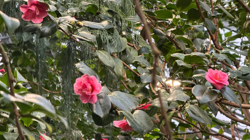 Камелии дают цветки примерно с ноября до конца февраля. За этот срок сорта меняются, поэтому у гостей есть возможность посещать сад раз в пару недель, чтобы каждый раз любоваться свежими и интересными растениями.