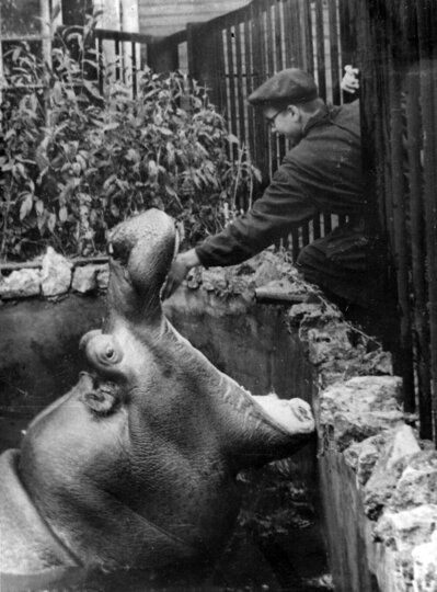 Начало 1950-х. Олег Юнчис чешет нёбо бегемоту Бэмби