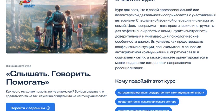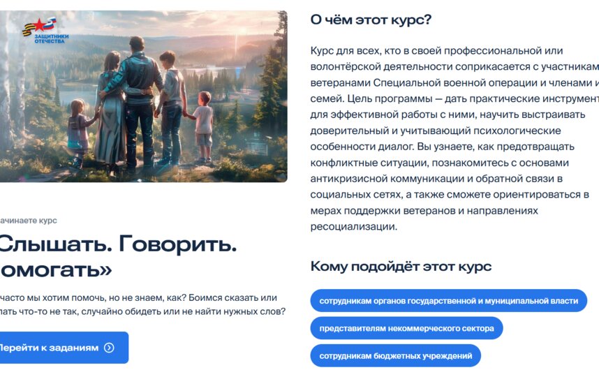 Курс создан для сотрудников органов государственной и муниципальной власти, представителей некоммерческого сектора, взаимодействующих с ветеранами СВО и их семьями. Доступ к курсу можно получить на онлайн-платформе "Диалог Регионы Про".