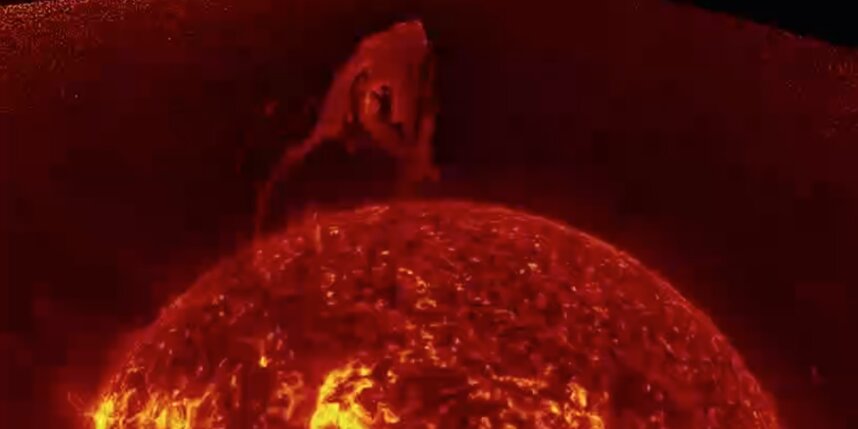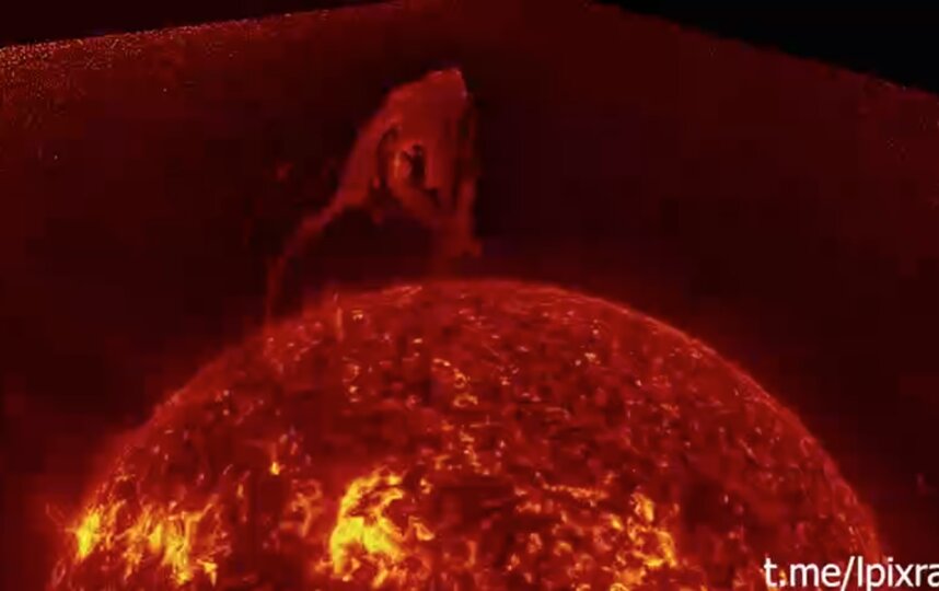 Как сообщили 3 марта учёные в своём телеграм-канале, размер протуберанца, оторвавшегося от Солнца, составляет около миллиона километров. Отмечается, что эта цифра в три раза превышает расстояние от Земли до Луны.
