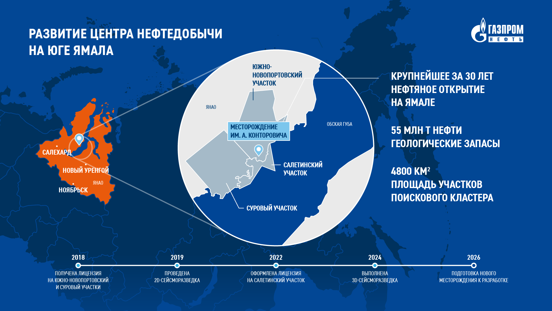 Месторождение было открыто в пределах Южно-Новопортовского и Салетинского участков в Ямальском районе ЯНАО. Месторождению было присвоено имя Алексея Конторовича - одного из основоположников отечественной научной школы геологии нефти и газа и органической геохимии. Открытие стало возможным благодаря трехлетнему исследованию с использованием 2D- и 3D сейсморазведки, а также созданием геологической и гидродинамической моделей недр.