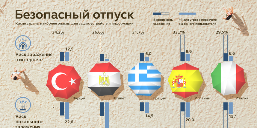 Чуть ниже риск в Испании (33,7%). В пятёрку попали Греция (31,7%), Италия (29,5%) и Египет (26,6%). Наибольшей опасности подвергаются мобильные устройства – смартфоны и планшеты, на которых хранятся большие объёмы персональных данных. Проблема усугубляется тем, что эти гаджеты всё активнее используются для совершения покупок в Интернете и управления банковским счётом онлайн.