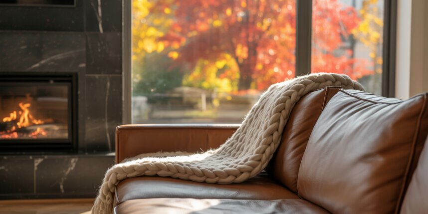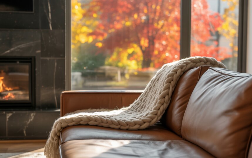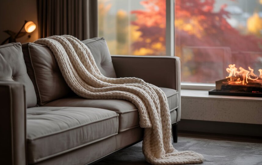 Забудьте о гладких поверхностях. Этой осенью в тренде тактильность: букле, твид, грубая шерсть. Добавьте подушки из фактурных тканей, плед крупной вязки или ковёр с высоким ворсом. Руки сами будут тянуться к этим поверхностям.