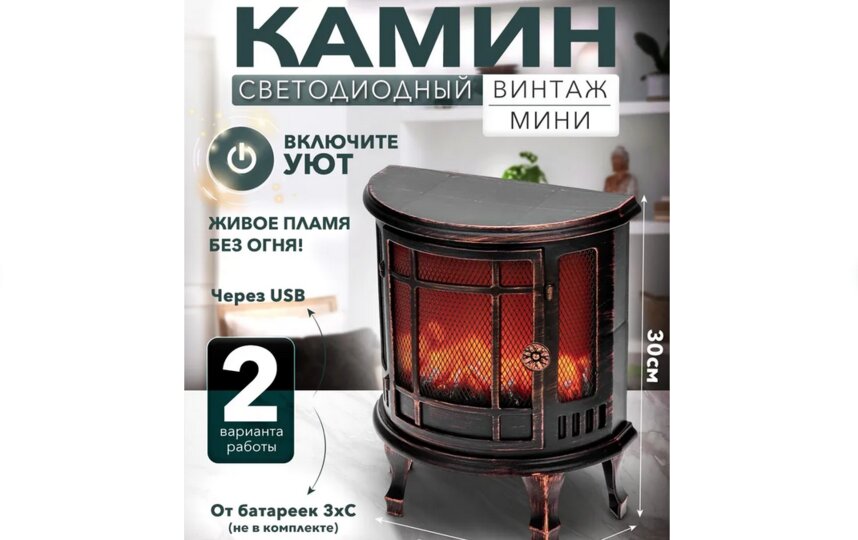 Этот светильник с имитацией горящих дров и эффектом живого огня хоть и совсем небольшой, но отлично дополнит интерьер. Его можно безопасно использовать даже как ночник в детской комнате. Автономное питание позволяет разместить камин в любом месте и перемещать из комнаты в комнату при необходимости. Работает от USB, а также от батареек.
