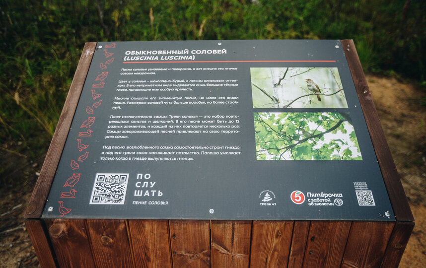 Рекреационная зона оборудована интерактивными информационными щитами, на которых отдыхающие могут послушать голоса птиц, животных, звуки природных явлений. Дополнительно установлены стенды о правилах поведения в лесу с занимательными фактами из мира природы. В частности, о встречающихся в природе белых шумах - звуках проливного дождя или ветра, шумящего листвой деревьев, - под которые люди засыпают на 40 % быстрее. Помимо информационных материалов представлены интерактивные арт-объекты с использованием нейросетевых технологий.