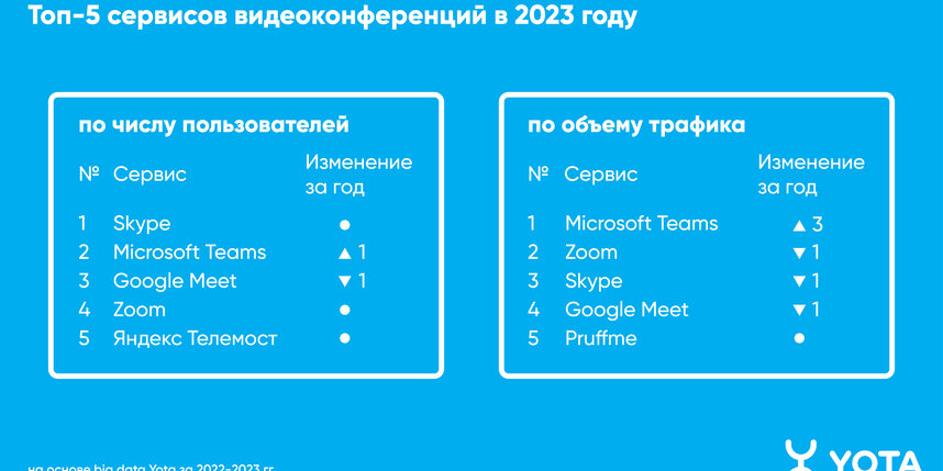 По итогам 2023 года Zoom потерял лидерство среди сервисов для видеоконференций: расход трафика внутри приложения снизился на 38% в сравнении с 2022 годом. Аналогичный спад демонстрирует Skype, где активность абонентов уменьшилась на 34%, а также Google Meet – падение на 30%. На первую строчку вырвался Microsoft Teams, он единственный среди иностранных сервисов этого сегмента показал значительный рост потребляемого трафика – в три раза.