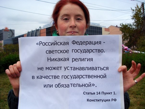 На плакате была написана цитата из 14-й статьи Конституции РФ: "Российская Федерация — светское государство. Никакая религия не может устанавливаться в качестве государственной или обязательной".