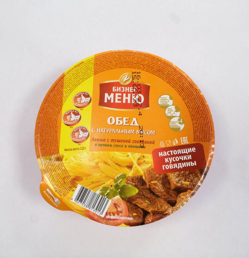 "Лично меня подкупила лаконичная надпись на упаковке: "Обед с натуральным мясом". К сухой лапше действительно прилагался приличный пакетик, в котором находилось что-то среднее между тушёнкой и кошачьим кормом. Но сомневалась я зря. Лапша вполне приличная, мясо настоящее. И даже бульон оказался насыщенным", - Алёна Бобрович,