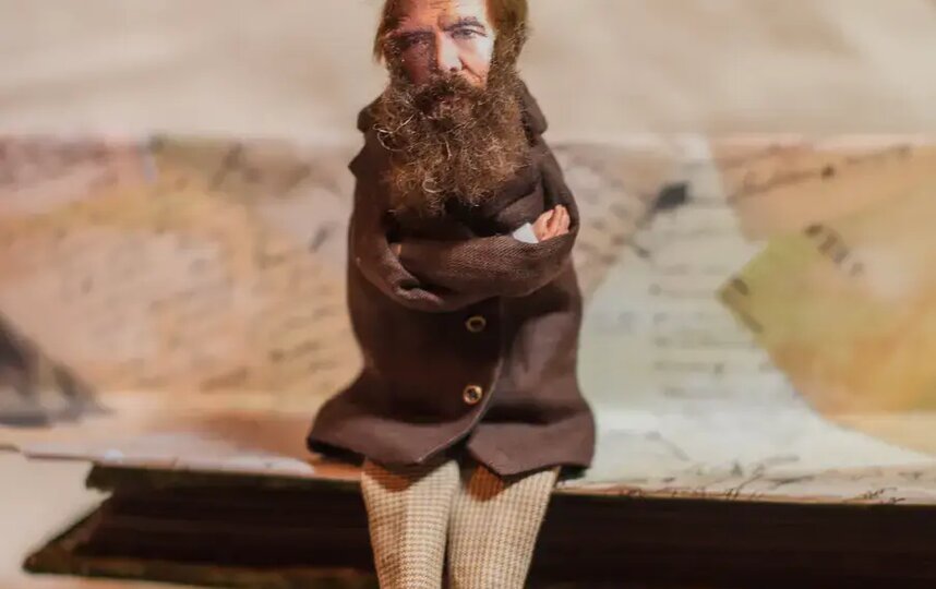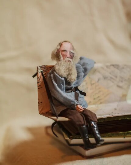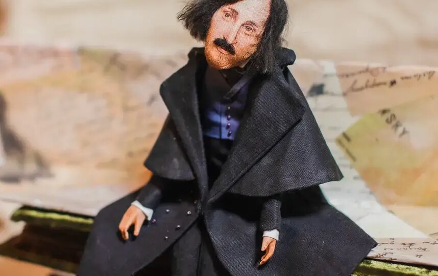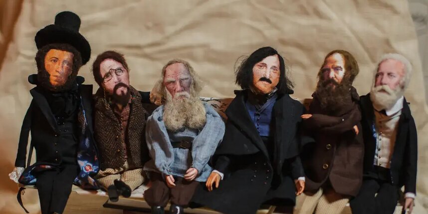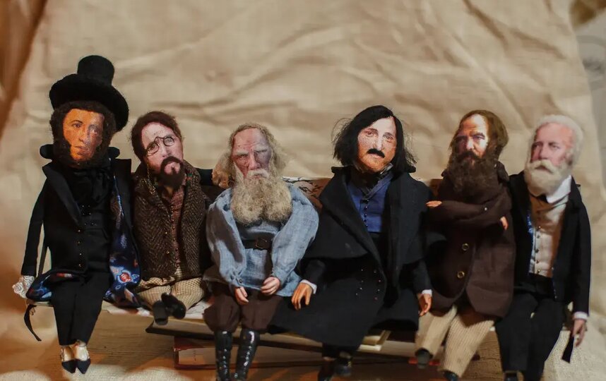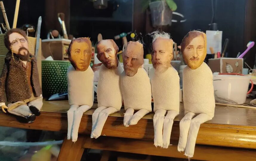 Великие русские классики собрались вместе в прошлом году. Точнее, их собрала художник Мария Новокрещёнова. Уже много лет она создаёт игрушки и куклы из войлока, но иногда и из ткани. Тельца, ручки и ножки для этих кукол она сшила, а ботиночки и кисти рук вылепила из специальной самозастывающей кукольной глины, покрыла акрилом. Чтобы было идеальное сходство, лица печатались с картин и фотографий, детали расписывались вручную. Для волос мастер выбрала овечью шерсть.