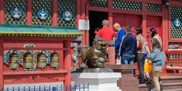 Новый дуган строился несколько лет, оформлением его занимались лучшие художники Бурятии. Сейчас это самый яркий храм на территории дацана и самый посещаемый.
