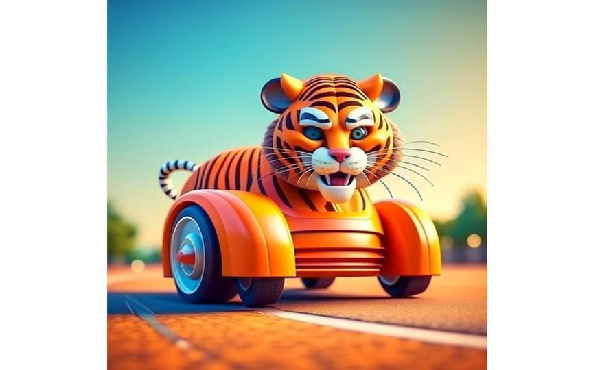 Спортивный маленький автомобиль в виде тигра едет на скорости.