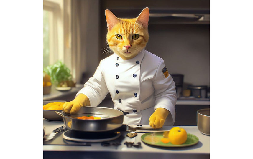Самой сложной оказалась задача создать прямоидущего кота. Обе нейросетки упорно отказывались рисовать его стоящим на задних лапах, какие бы запросы я ни вбивала. "Кот идет в офис на задних лапах и держит в руках портфель", "кот стоит на задних лапах, а в передних держит черешню", "кот стоит" и так далее. Коты не сдавались и всеми четырьмя конечностями крепко держались за землю. Предметы стояли возле них или находились в зверином рту. В итоге, добавив в поле запроса фразу "руки вверх", удалось добиться изображения шестилапого кота, больше напоминающего индийских богов. Возможно, нейросеть и правда обучается в процессе работы с пользователями. Через три дня мучений на предложение "кот научился ходить на ногах" в "Кандинском" пушистик задрал одну переднюю лапку, а в "Шедевруме" он действительно ровно встал.