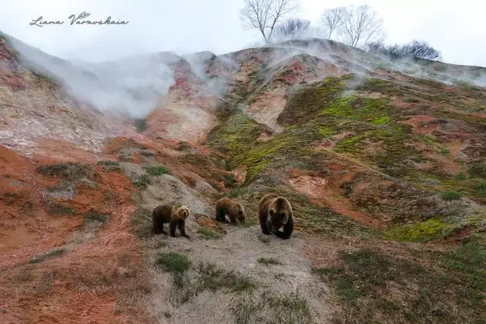 Медведица с медвежатами на фоне "марсианских" цветов Долины гейзеров.