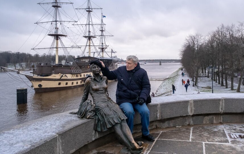 По пешеходному мосту через реку Волхов можно перейти на другой берег, сфотографироваться рядом со скульптурой "Уставшая туристка" и осмотреть белокаменные церкви. Здесь их великое множество, ведь не случайно Великий Новгород называют городом-музеем Древней Руси.