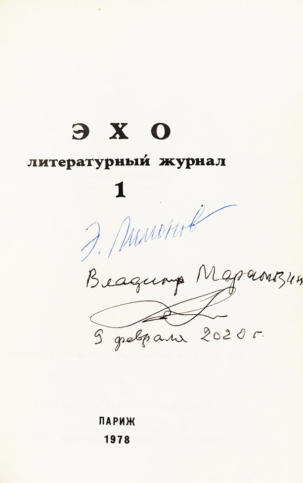 Примечателен на грядущих торгах и полный комплект литературного журнала "Эхо" (Париж, 1978–1986 гг.), который выпускали мэтры отечественного искусства – писатель Владимир Марамзин и музыкант Алексей Хвостенко на личные средства первого. "Эхо" – литературный журнал третьей волны эмиграции, всего за 9 лет издали 14 номеров. Заявленный комплект включает все выпущенные 14 номеров и сопровождается автографами Эдуарда Лимонова, Михаил Шемякина и самого издателя Владимира Марамзина.