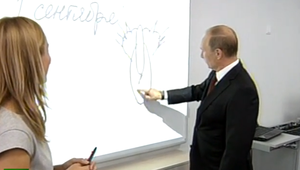 Там президенту России показали интерактивную доску, которую он тут же опробовал. Ученики некоторое время оставались в замешательстве от рисунка президента, однако вскоре Владимир Путин пояснил, что нарисовал кошку: "Это кошка. Вид? сзади", - сказал глава государства.