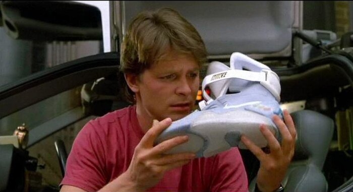 По сюжету фильма главный герой Марти Макфлай переносится из 80-х в 2015 год и помимо прочих футуристических штук обнаруживает кроссовки, которые завязываются и принимают форму ступни сами, стоит только засунуть в них ногу и нажать на кнопку.