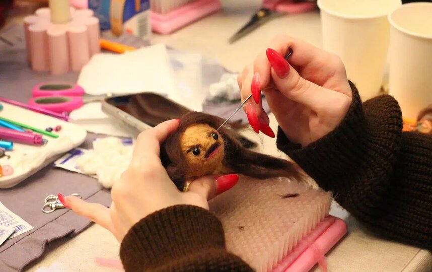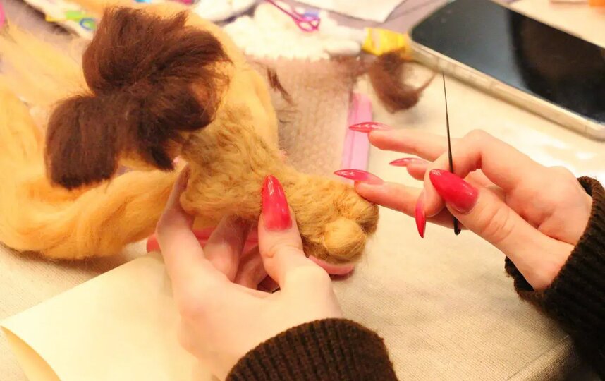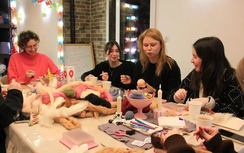 В центре стола – разноцветная шерсть, которая выглядит почти как сахарная вата. У каждой девушки в руках иголка, с помощью которой бесформенные клочки превращаются в нужные им формы.