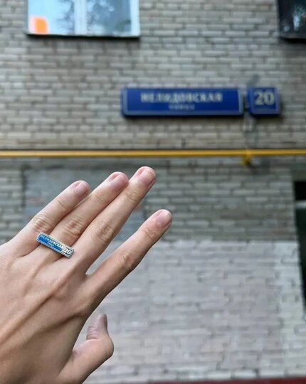 Так у Кати оказался снимок угла её дома, а на нём – синяя узнаваемая табличка, которую тут же захотелось иметь при себе. Сделанное под свой размер серебряное кольцо с эмалью девушка выложила в соцсети – и так начала перекличку столичных улиц. "Привет соседям со Свободы", "Тушино на месте!" и самый популярный комментарий – "Блин, захотел такое кольцо, а потом вспомнил, что тогда там будет написано "Шарикоподшипниковская улица, 36/18" и это уже кастет будет, вы делаете кастеты?"