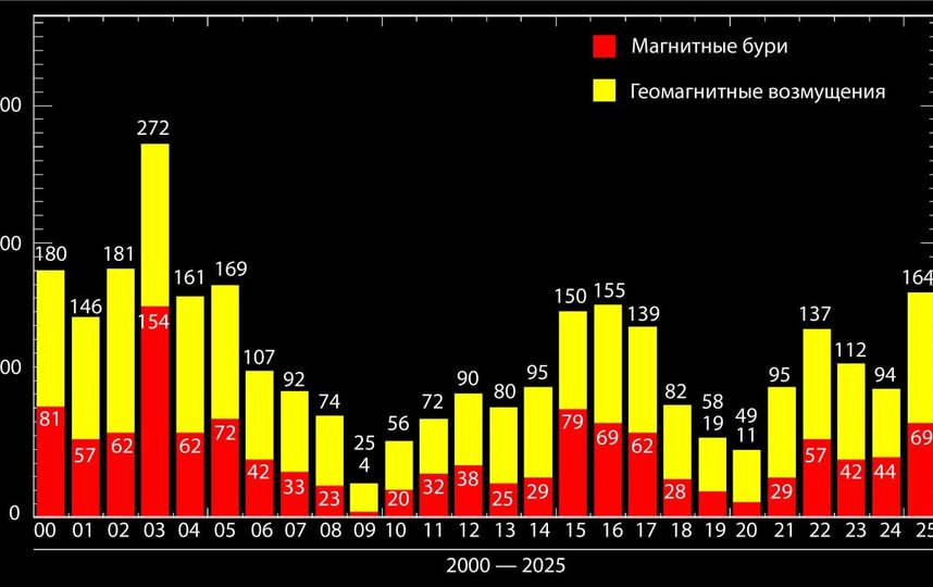 2025 год стал одним из самых беспокойных за последние два десятилетия. За истекшие 358 дней магнитные бури фиксировались 69 раз, что значительно превышает показатель 2024 года (44 случая).
