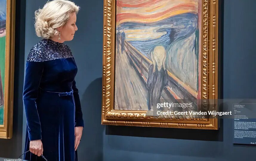 Королева Матильда Бельгийская рассматривает картину "Крик" Эдварда Мунка во время посещения Национального музея в Осло.