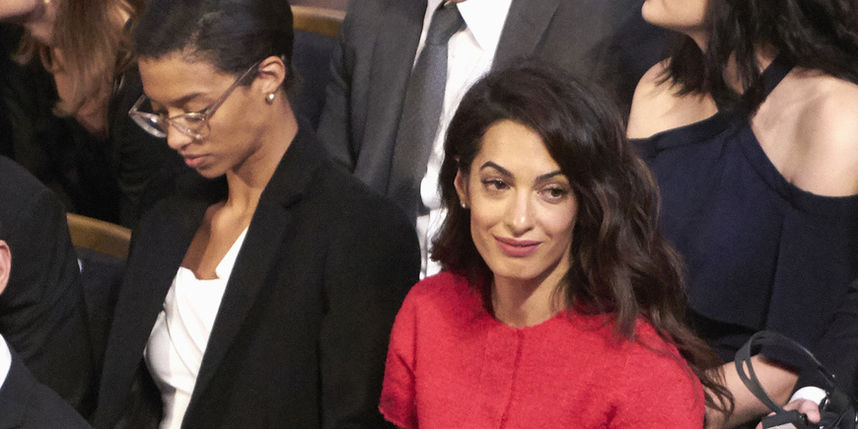Амаль Клуни, которую пригласили на церемонию, выделялась среди гостей - она выбрала ярко-красное платье и выглядела в нем очень эффектно. 40-летняя Амаль Клуни - правозащитница, она специализируется на международном праве и защите прав человека.