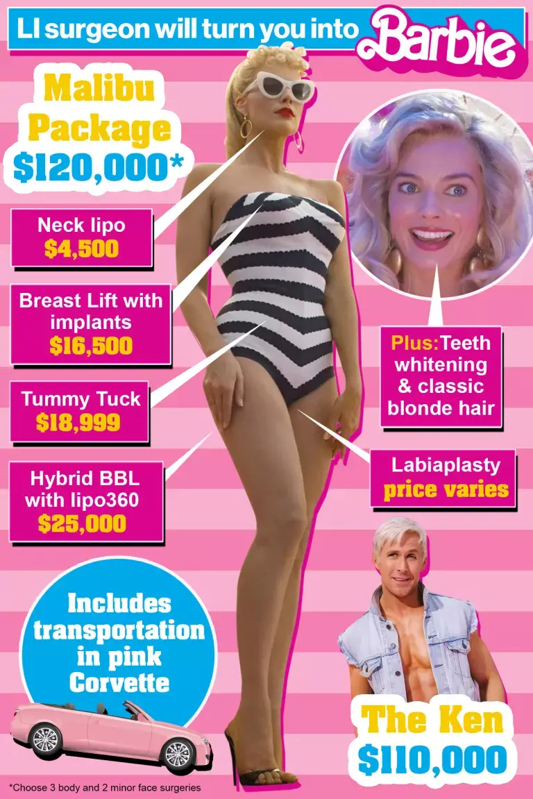 Для женщин в услугу, придуманную доктором Скоттом Блайером из нью-йоркского центра хирургии "Камео", входят три операции на теле, пластика лица, а еще можно сделать "классические волосы Барби", розовые ногти и отбелить зубы. Стоит превращение в куклу 120 тысяч долларов.